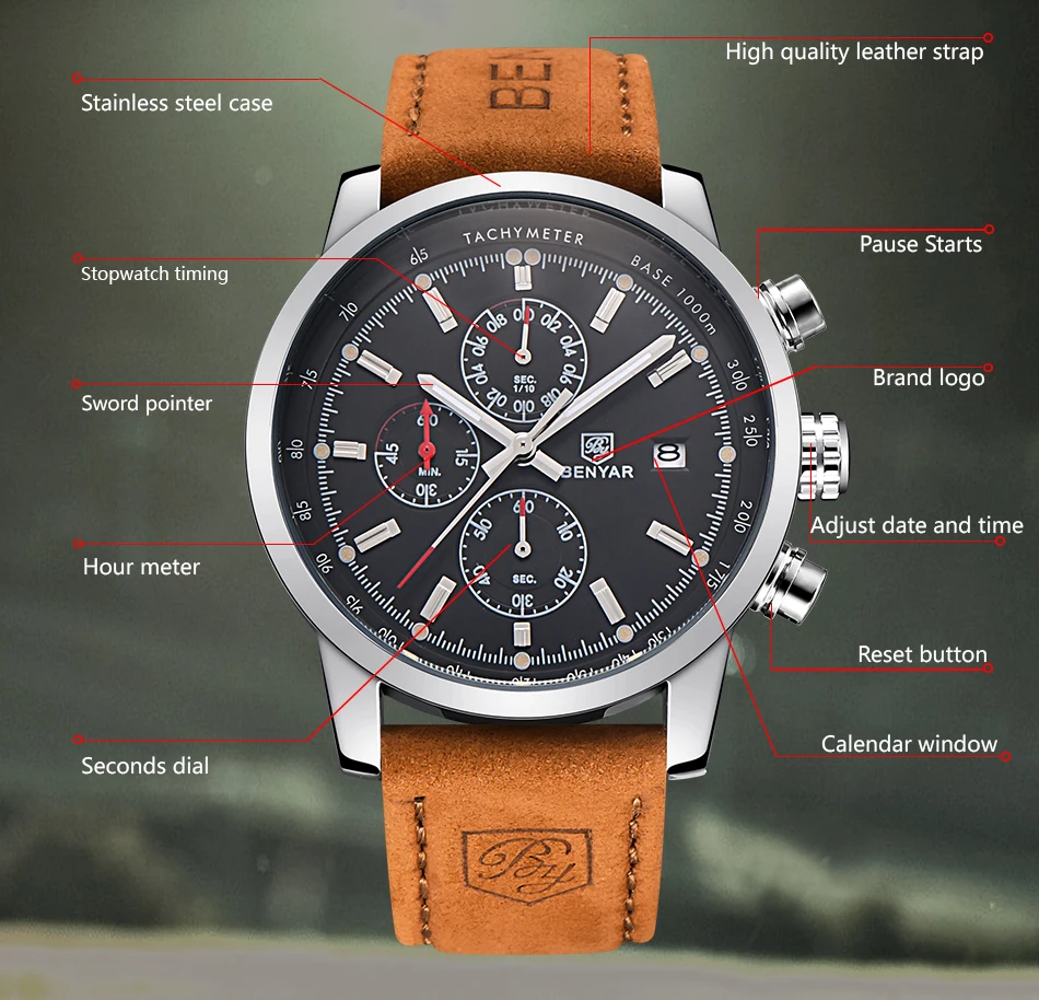 Benyar Atlanitic. Duża tarcza 43 mm, szkiełko hardlex, datownik, stoper, odporność na wodę, skórzany lub metalowy pasek, fosforyzujące wskazówki - razem bardzo nęcąca całość. Symbol BY-5102. wersje kolorystyczne dotyczą koloru i rodzaju paska oraz tarcz, dominuje czerń, srebrny, szarość.